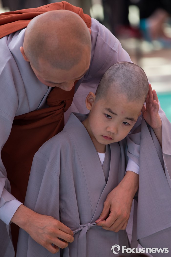 (서울=포커스뉴스) 2일 오전 서울 종로구 조계사 대웅전 앞마당에서 열린 동자승 단기출가 보리수 새싹학교 삭발, 수계식에서 동자승들이 삭발을 마친 뒤 머리를 만져보고 있다.