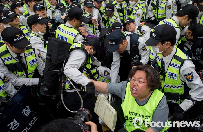 (서울=포커스뉴스) 근로자의날을 맞은 1일 오후 서울 종로구 대학로에서 민주노총 주최로 열린 '2016 세계노동절대회'에서 경찰과 420장애인차별철폐공동투쟁단원들이 충돌하고 있다.