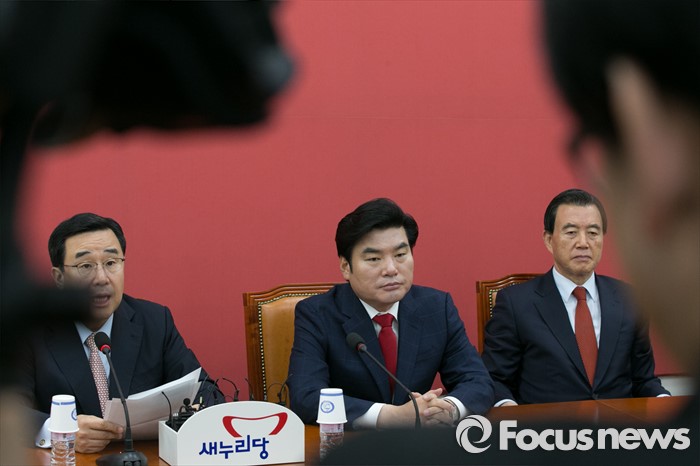 (서울=포커스뉴스) 김정훈(왼쪽) 새누리당 정책위의장이 29일 오전 서울 여의도 국회에서 열린 원내대책회의에 참석해, 발언하는 동안, 원유철(가운데) 새누리당 대표최고위원 권한대행과 홍문표 제1사무부총장이 생각에 잠겨 있다.