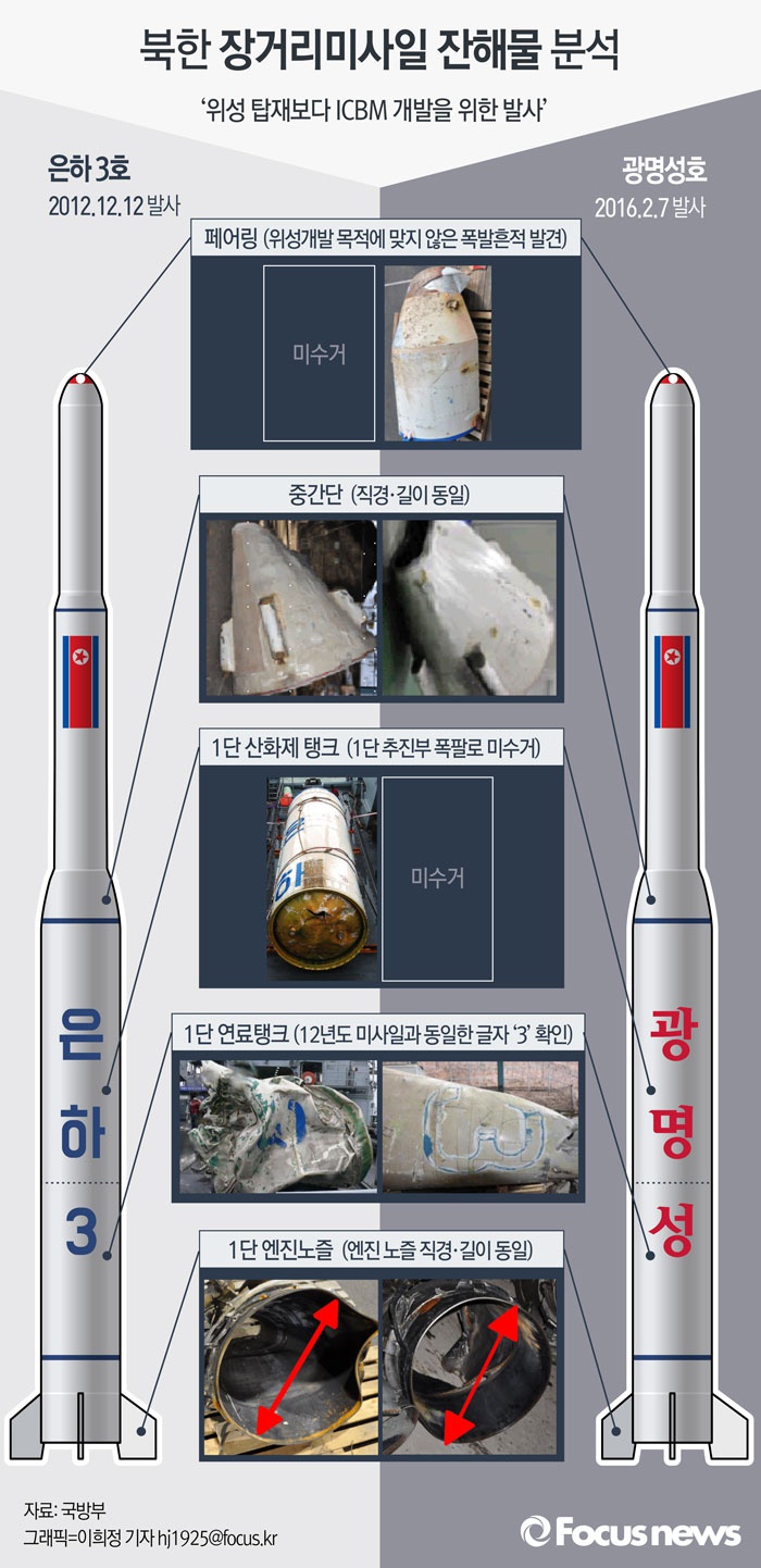 1단 추진체 잔해와 페어링은 북한이 예고한 예상 낙하 지역 내 떨어졌고, 북미우주항공방위사령부(NORAD)는 탑재체가 임무궤도에 진입된 것을 확인했다.(서울=포커스뉴스) 27일 국방부는 북한이 지난 2월 7일 발사한 장거리 미사일의 잔해 분석 결과를 발표했다. 북한이 위성개발을 위해 발사했다고 주장하는 '광명성 4호'는 지난 2012년 발사한 장거리 미사일 ‘은하 3호’와 거의 같으며 장거리탄도미사일 개발을 위한 것이라고 결론을 내렸다.2016.04.28 이희정 기자 (서울=포커스뉴스) 27일 국방부는 북한이 지난 2월 7일 발사한 장거리 미사일의 잔해를 분석한 결과 위성개발 목적이 아닌 장거리탄도미사일 개발을 위한 것이라고 결론을 내렸다. 또 우리군이 수거하지 못하도록 미사일 1단 추진부를 의도적으로 폭파한 흔적도 발표했다.2016.04.28 이인규 인턴기자
