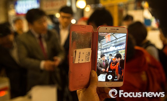 (서울=포커스뉴스) 27일 오전 서울 동작구 노량진 수산시장에서 한 상인이 점유이전금지가처분 집행 관련 설명하는 공무원을 동영상으로 촬영하고 있다.