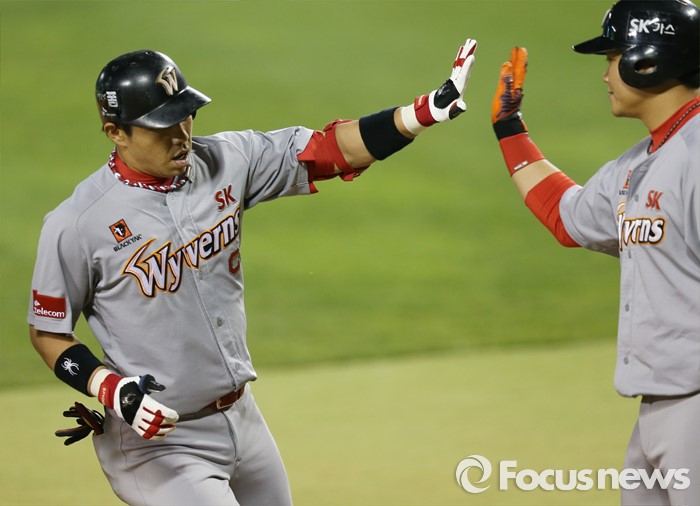 (서울=포커스뉴스) 27일 서울 잠실구장에서 열린 2016 프로야구 SK-두산 경기 5회초 SK 선두타자 김강민(왼쪽)이 좌월 솔로 홈런을 치고 최승준의 환영을 받으며 홈인하고 있다.