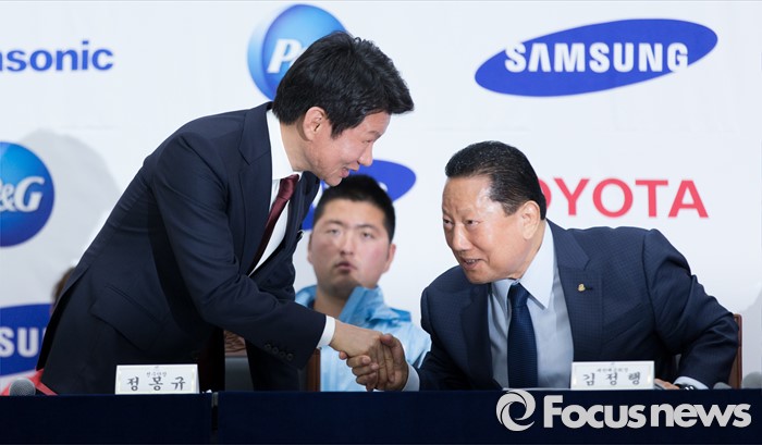 (서울=포커스뉴스) 27일 오후 서울 노원구 태릉선수촌에서 제31회 리우하계올림픽대회 D-100일 미디어데이에 참석한 정몽규(왼쪽) 선수단장이 다른 일정으로 먼저 퇴장하며 김정행 대한체육회장과 인사를 하고 있다.