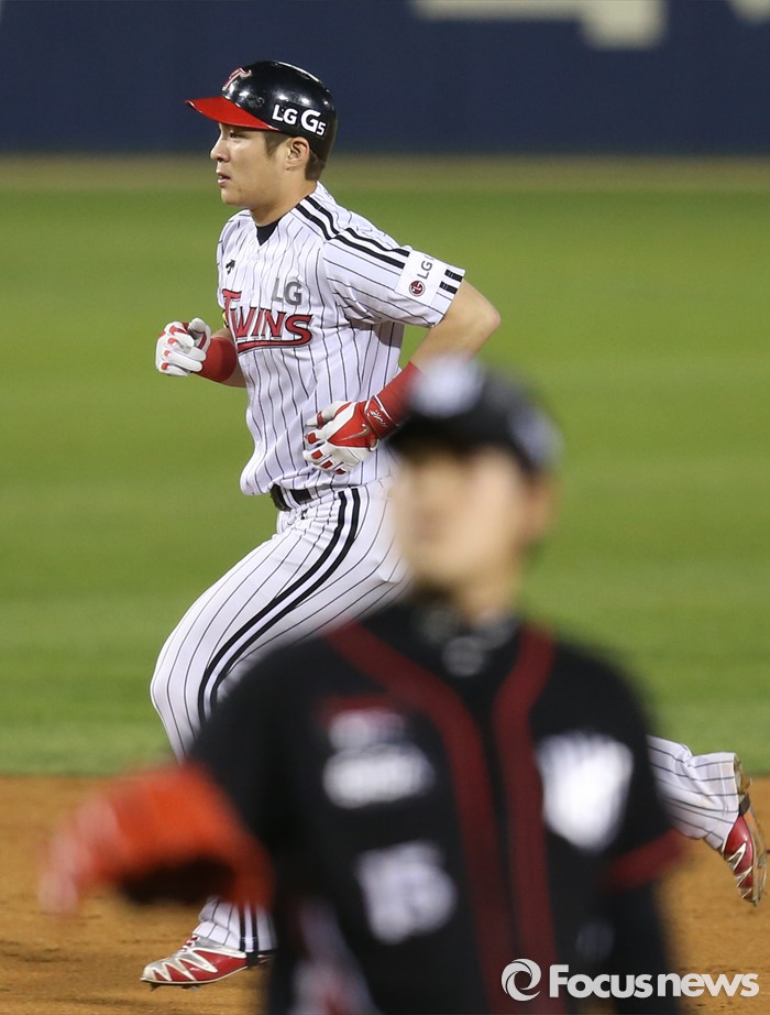 (서울=포커스뉴스) 29일 서울 잠실구장에서 열린 2016 프로야구 kt-LG 경기 5회말 LG 선두타자 오지환이 동점 우월 솔로 홈런을 치고 베이스를 돌고 있다.
