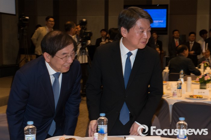 (서울=포커스뉴스) 2일 오후 서울 중구 프레스센터에서 열린 BBS 불교방송 개국 26주년 기념 비전선포식에 참석한 안철수(오른쪽) 국민의당 상임공동대표와 박원순 서울시장이 자리에 앉고 있다.