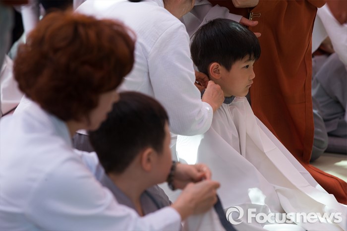 (서울=포커스뉴스) 2일 오전 서울 종로구 조계사 대웅전 앞마당에서 열린 동자승 단기출가 보리수 새싹학교 삭발, 수계식에서 동자승들이 삭발을 준비하고 있다.