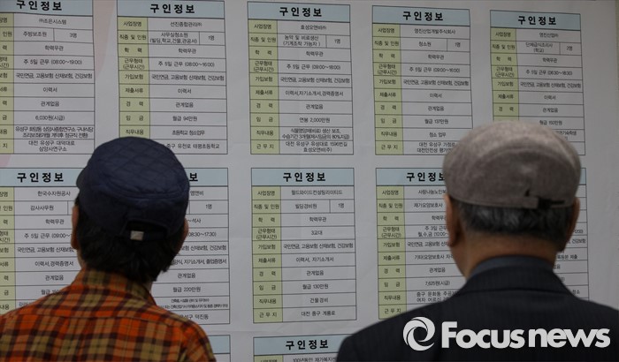 (대전=포커스뉴스) 28일 오후 대전 서구 노인복지관 3층 대강당에서 열린 찾아가는 시니어 취업 박람회를 찾은 구직희망자가 구인광고를 살피고 있다.