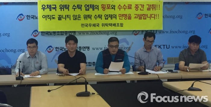 (서울=포커스뉴스) 전국우체국 위탁택배조합이 26일 오전 서울 영등포구 한국노동조합총연맹 사무실에서 기자회견을 열고 우체국 위탁 민간업체들의 '갑질'을 고발했다.