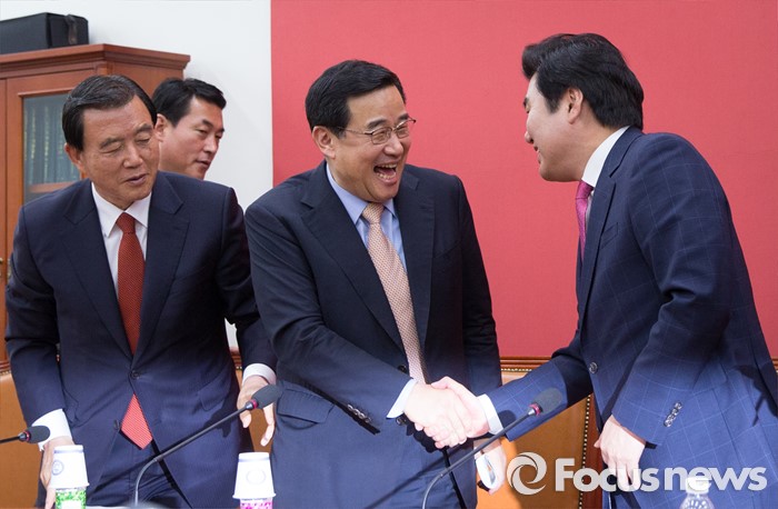 (서울=포커스뉴스) 원유철(오른쪽) 새누리당 대표최고위원 권한대행과 김정훈 정책위의장이 2일 오전 서울 여의도 국회에서 열린 마지막 원내대책회의를 마친 뒤, 인사하고 있다.