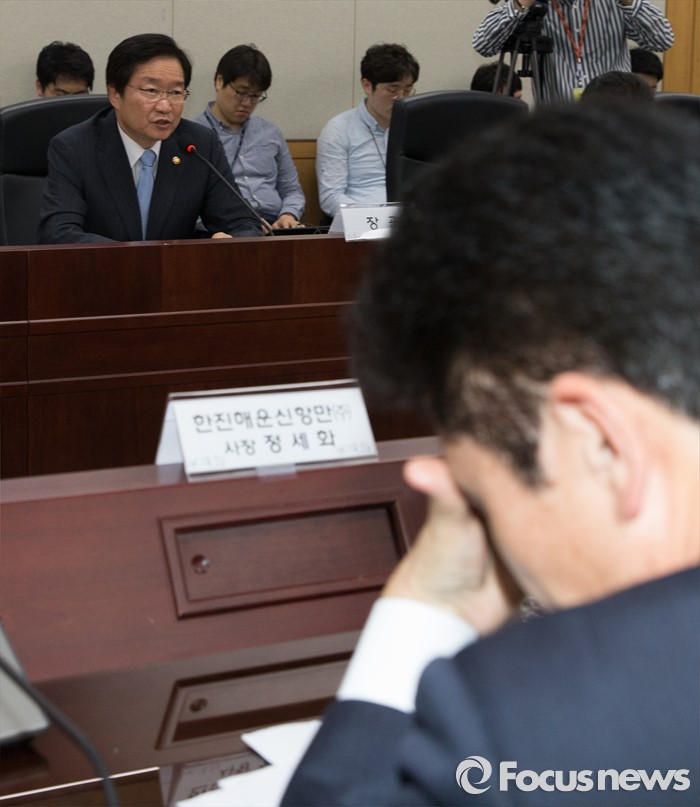 (세종=포커스뉴스) 김영석 해양수산부 장관이 25일 오후 세종시 정부세종청사 해수부 중회의실에서 열린 해운시장 및 해운동맹 재편 관련 대책회의에서 모두발언 중에 정세화 한진해운신항만 사장이 고민하는 모습을 보이고 있다.