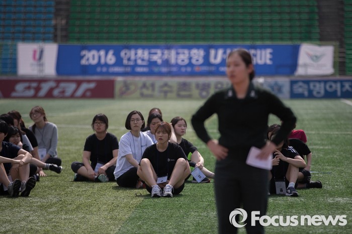 (서울=포커스뉴스) 28일 오후 서울 효창동 효창운동장에서 열린 학군단 57기 후보생 선발전형 체력검정에서 숙명여대 응시생들이 시험을치르고 있다.