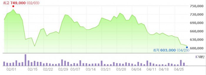 김 연구원은 "하향 조정한 목표가는 자산 가치와 신약 가치를 합산한 것"이라며 "투자포인트는 파이프라인 개발 진전에 따른 신약 가치 부각, 파이프라인에 있는 신약 후보물질들에 대한 추가 기술수출 등에 기대를 건다"고 분석했다.최근 3개월간 한미약품 주가 추이 <그래픽출처=네이버>