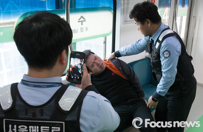 (서울=포커스뉴스) 28일 오후 서울 성동구 신설동행 열차 내에서 서울메트로 소속 지하철보안관들이 술에 취한 난동자를 제압하는 훈련을 하고 있다.