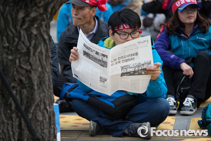 (서울=포커스뉴스) 27일 오후 서울 종로구 정부종합청사 앞에서 전교조(전국교직원노동조합)와 민주교육과 전교조 지키기 전국행동의 주최로 법외노조 후속조치 규탄 및 부당해고 저지, 노동기본권 쟁취를 위한 집회가 열리고 있다.