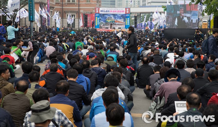 (서울=포커스뉴스) 30일 오후 서울역 광장에서 민주노총 공공운수 전국철도노동조합 회원들이 '철도노동자 1차 총력 결의대회'를 하고 있다.