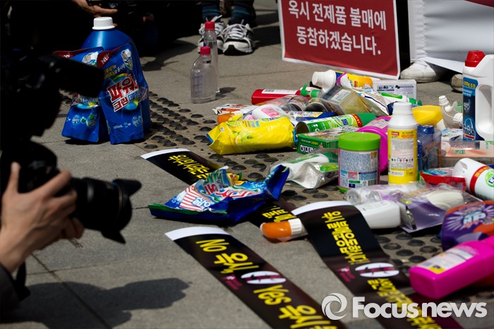 (서울=포커스뉴스) 25일 오전 서울 종로구 광화문 광장에서 옥시 가습기 살균제 피해 가족 및 환경단체 관계자들이 옥시 상품 불매를 촉구하는 기자회견을 하고 있다.