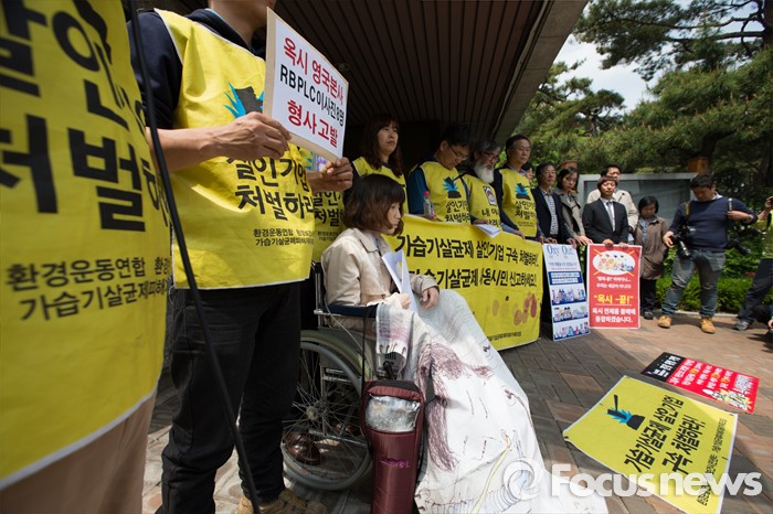 (서울=포커스뉴스) 2일 오후 서울 서초구 서울중앙지방검찰청 앞에서 가습기살균제 피해자와 가족모임과 환경보건시민센터 관계자들이 옥시레킷벤키저 대표 등 8명의 이사진 형사고발 기자회견을 하고 있다.