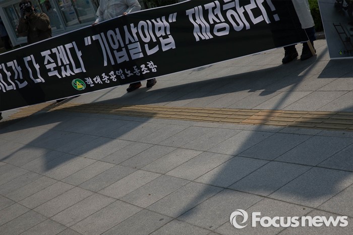 (서울=포커스뉴스) 29일 오후 서울 종로구 정부서울청사 앞에서 상경한 현대중공업노조원들이 구조조정 중단 및 산업현장 안정을 촉구하며 기자회견을 하고 있다.