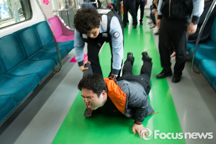 (서울=포커스뉴스) 28일 오후 서울 성동구 신설동행 열차 내에서 서울메트로 소속 지하철보안관들이 술에 취한 난동자를 제압하는 훈련을 하고 있다.