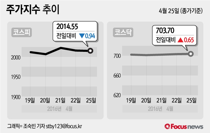 (서울=포커스뉴스) 25일 코스피지수는 22일 보다 0.05%(0.94포인트) 내린 2014.55, 코스닥지수는 0.09%(0.65포인트) 오른 703.70에 마감했다.