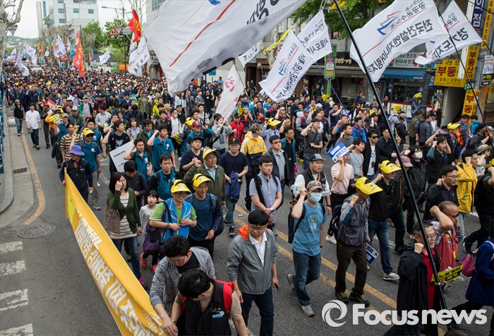 (서울=포커스뉴스) 근로자의날을 맞은 1일 오후 서울 종로구 대학로에서 민주노총 주최로 열린 '2016 세계노동절대회'를 마친 참가자들이 종로로 행진을 이어가고 있다.