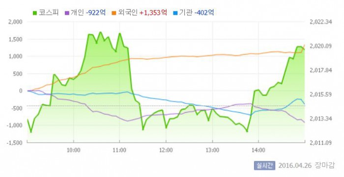 이날 코스피는 전일 대비 1.29포인트 내린 2013.26으로 장을 시작했다. 이후 지수는 등락을 반복하다가 장 중반 외국인의 매수 규모가 커지면서 상승세로 전환했다. 외국인은 이날 1000억원 넘게 사들이며 10거래일째 매수 행진을 이어갔다.