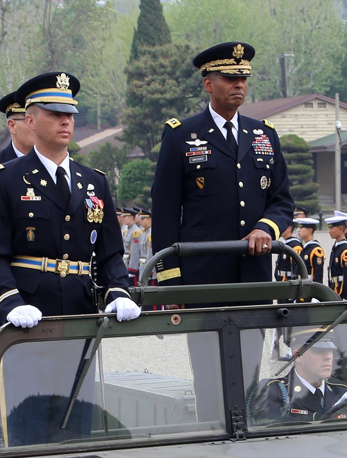 (서울=포커스뉴스) 빈센트 브룩스 신임 한·미연합사령관 겸 주한미군사령관이 30일 서울 용산기지 나이트필드에서 열린 이취임식에서 커티스 스카파로티 현 사령관과 의장대를 열병하고 있다. <사진제공=주한미군 홈페이지>