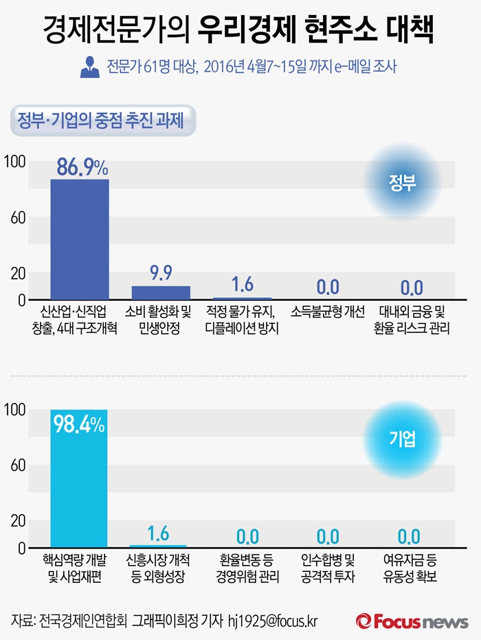 (서울=포커스뉴스) 25일 전국경제인연합회가 경제전문가 61명을 대상으로 '우리경제 현주소 평가 및 대책'을 조사한 결과에 따르면 전문가들은 우리경제가 경제체력을 제고하고 저성장을 극복하려면, 정부는 ‘신산업‧신직업 창출 및 구조개혁’(86.9%), 기업은 ‘핵심역량 개발 및 사업재편’(98.4%)에 중점을 두어야 한다고 답했다.