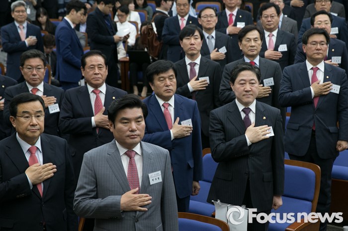 (서울=포커스뉴스) 원유철(앞줄 오른쪽) 새누리당 원내대표를 비롯한 제20대 총선 당선자들이 26일 오전 서울 여의도 국회에서 열린 당선자 워크숍에 참석해 국민의례를 하고 있다.
