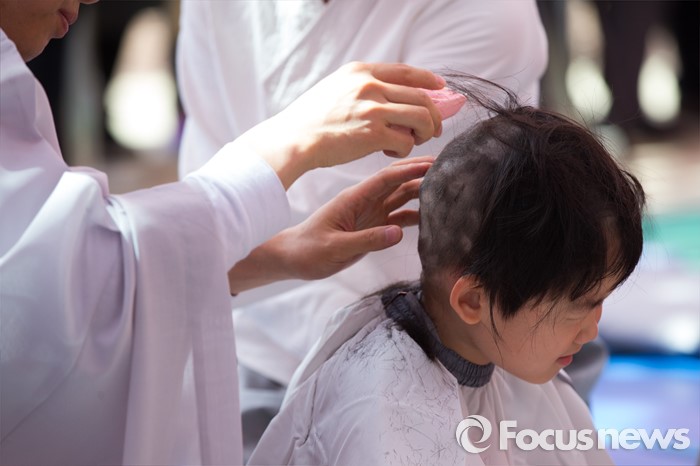 (서울=포커스뉴스) 2일 오전 서울 종로구 조계사 대웅전 앞마당에서 열린 동자승 단기출가 보리수 새싹학교 삭발, 수계식에서 동자승들이 삭발을 하고 있다.