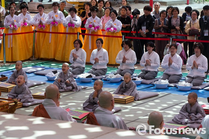 (서울=포커스뉴스) 2일 오전 서울 종로구 조계사 대웅전 앞마당에서 열린 동자승 단기출가 보리수 새싹학교 삭발, 수계식에서 동자승들이 삭발한 뒤 스님들이 합장을 하고 있다.
