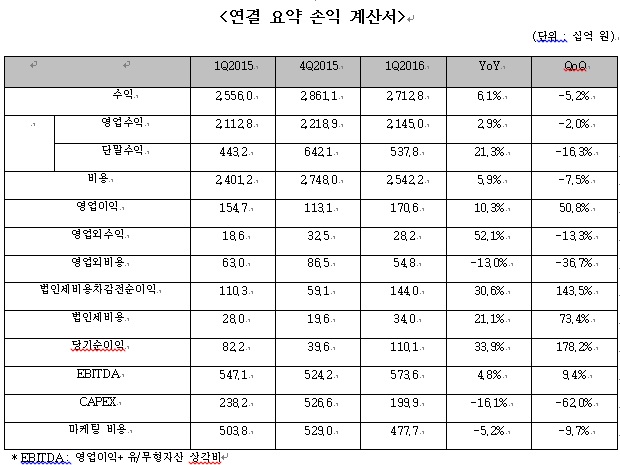 영업매출은 유선 및 무선 서비스 수익 증가에 힘입어 전년 동기 대비 2.9% 성장한 2조 1750억 원을 달성했다.