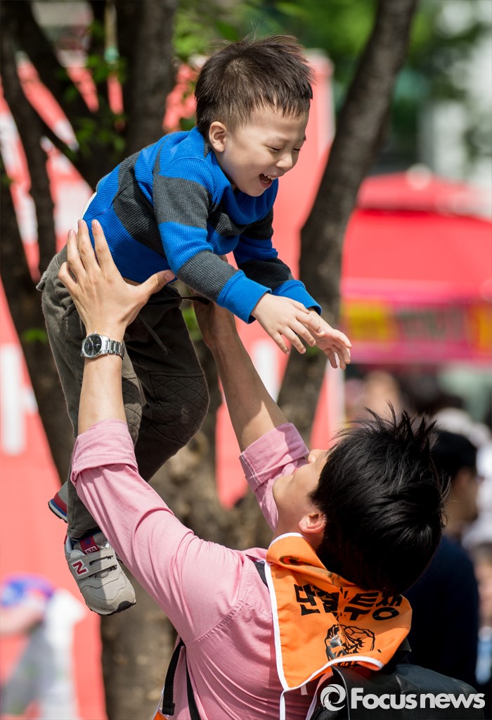 (서울=포커스뉴스) 근로자의날을 맞은 1일 오후 서울광장에서 열린 한국노총 5.1 전국노동자대회에 참가한 한 어린이가아빠와 놀고 있다.