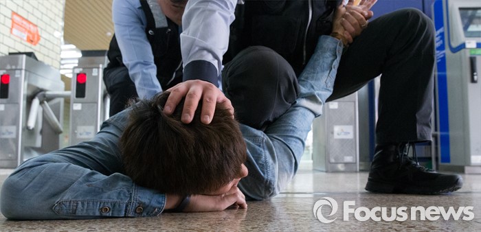 (서울=포커스뉴스) 28일 오후 서울 성동구 성수역 대합실에서 서울메트로 소속 지하철보안관들이 술에 취한 난동자를 제압하는 훈련을 하고 있다.