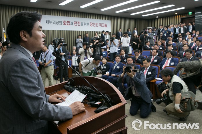 (서울=포커스뉴스) 원유철(왼쪽) 새누리당 원내대표가 26일 오전 서울 여의도 국회에서 열린 당선자 워크숍에 참석해, 인사말을 하고 있다.