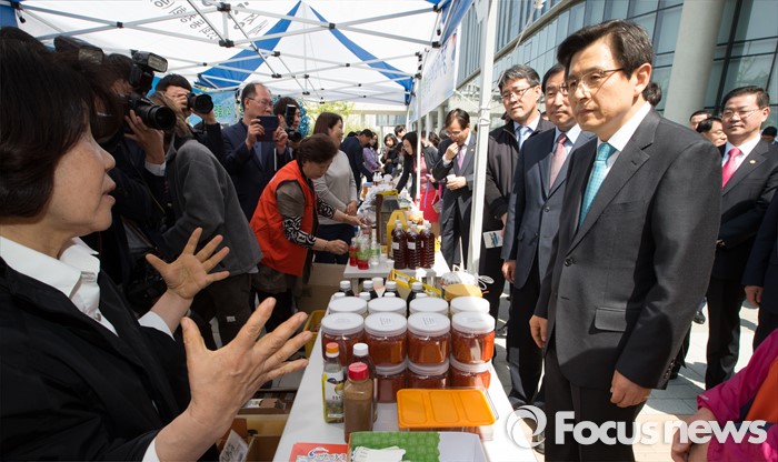 (세종=포커스뉴스) 황교안 국무총리가 26일 오전 세종시 정부세종청사 국토교통부 내 광장에서 열린 국무총리실과 1사 1촌 자매결연을 맺은 충주 재오개마을 농·특산물 직거래 장터에 방문해 농산물에 대해 주민과 대화하고 있다.