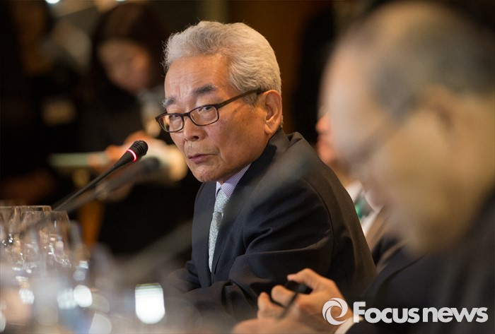 (서울=포커스뉴스) 유일호 경제부총리 겸 기획재정부 장관이 참석한 가운데 28일 오후 서울 서초구 JW메리어트호텔에서 역대 부총리 및 장관과의 만찬 간담회가 열리고 있다. 진념 전 경제부총리가 모두발언을 하고 있다.