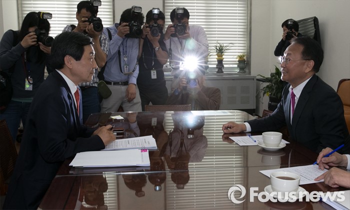 (서울=포커스뉴스) 이종걸(왼쪽) 더불어민주당 원내대표가 29일 오전 서울 여의도 국회에서 경제활성화법안 등 처리 요청을 위해 방문한 유일호 경제부총리 겸 기획재정부 장관과 면담하고 있다.
