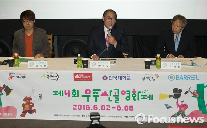 (서울=포커스뉴스) 26일 오전 서울 동작구 아트나인에서 열린 '제4회 무주산골 영화제' 기자간담회에 참석한 황정수 조직위원장이 인사말을 하고 있다. 왼쪽부터 조지훈 부 집행위원장, 황정수 조직위원장, 유기하 집행위원장.