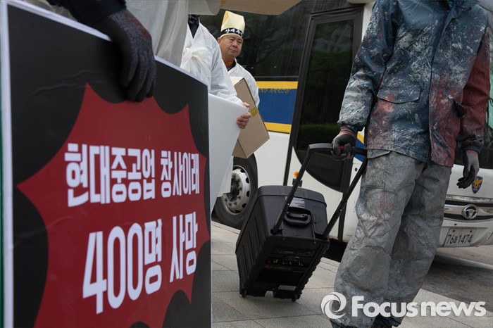(서울=포커스뉴스) 29일 오후 서울 종로구 정부서울청사 앞에서 상경한 현대중공업노조원들이 구조조정 중단 및 산업현장 안정을 촉구하는 기자회견을 준비하고 있다.
