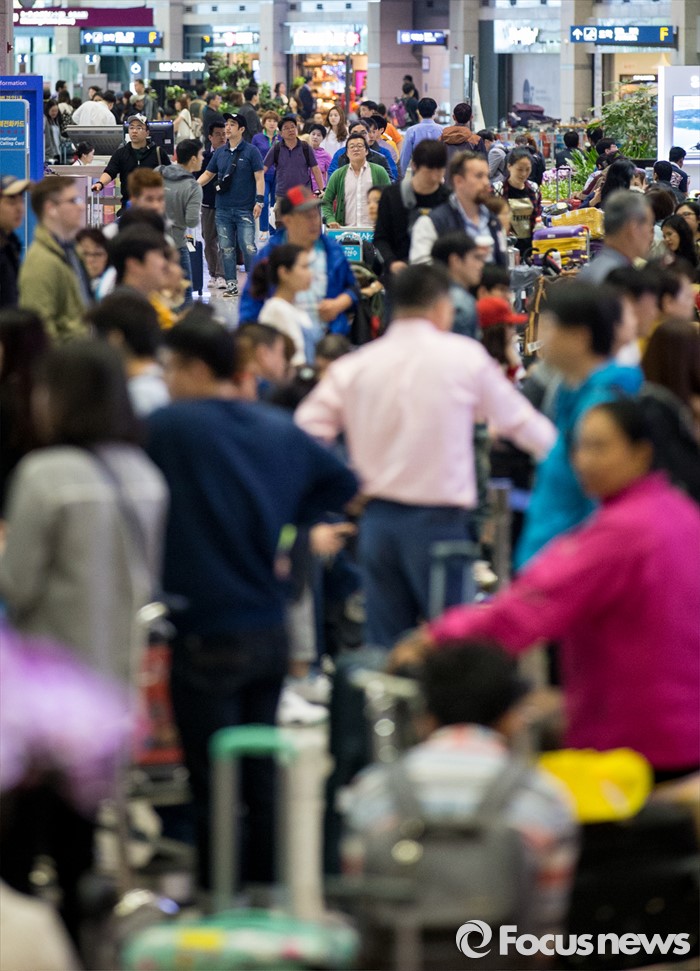 (영종도=포커스뉴스) 중국 노동절 연휴와 일본 골든 위크를 맞아 1일 외국인 관광객들이 인천국제공항을 통해 입국하고 있다.