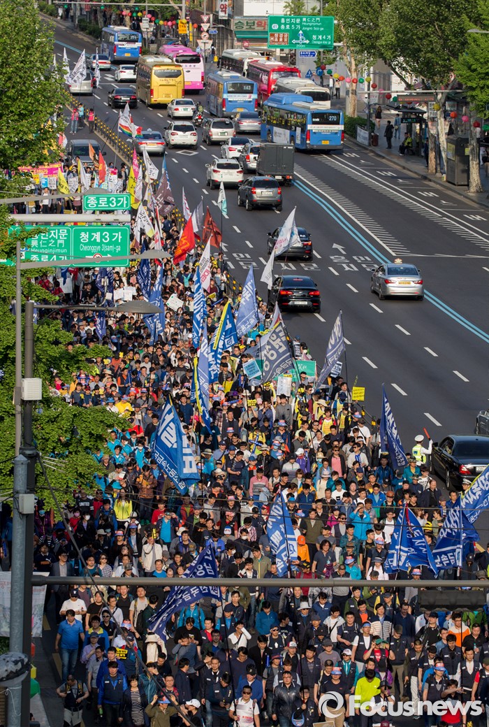 (서울=포커스뉴스) 근로자의날을 맞은 1일 오후 서울 종로구 대학로에서 민주노총 주최로 열린 '2016 세계노동절대회'를 마친 참가자들이 종로로 행진을 이어가고 있다.