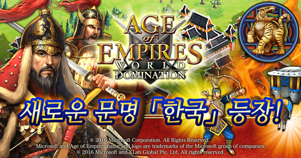 (서울=포커스뉴스) 크라브주식회사(대표 사나다 테츠야)는 실시간 전략게임 '에이지 오브 엠파이어:월드도미네이션'(Age of Empires : World Domination)에 한국 문명을 새롭게 추가한다고 28일 밝혔다.