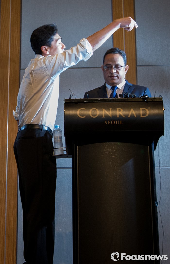 (서울=포커스뉴스) 2일 오전 서울 영등포구 콘래드호텔에서 열린 '옥시레킷벤키저(현 RB코리아) 가습기 살균제 파동' 관련 기자회견에서 아타 울라시드 사프달 옥시코리아 대표가 피해자 가족들에게 항의 받고 있다.