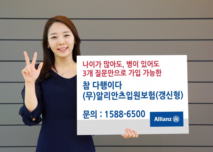 (서울=포커스뉴스) 알리안츠생명은 노인성 질환을 앓고 있는 고령 고객들도 간단한 청약 과정만 거치면 질병과 재해의 입원·수술 등을 보장받을 수 있는 '참다행이다(무)알리안츠입원보험(갱신형)'을 판매한다고 2일 밝혔다.