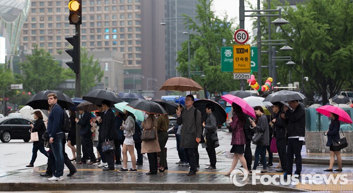 (서울=포커스뉴스) 전국이 흐리고 비가 내리는 3일 오전 서울 광화문네거리에서 시민들이 발걸음을 재촉하고 있다.