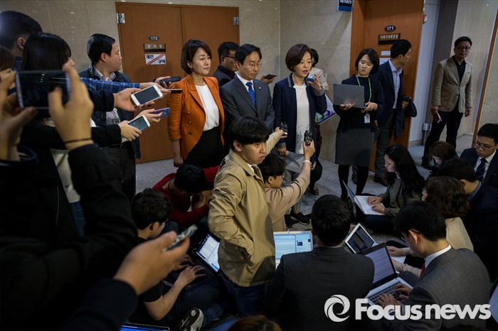 (서울=포커스뉴스) 진선미(오른쪽) 더불어민주당 의원이 3일 오후 서울 여의도 국회에서 어버이연합 등 보수단체 불법자금지원 의혹 관련 기자회견을 마친 뒤 취재진 질문에 답하고 있다.