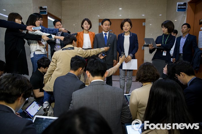 (서울=포커스뉴스) 진선미(오른쪽) 더불어민주당 의원이 3일 오후 서울 여의도 국회에서 어버이연합 등 보수단체 불법자금지원 의혹 관련 기자회견을 마친 뒤 취재진 질문에 답하고 있다.