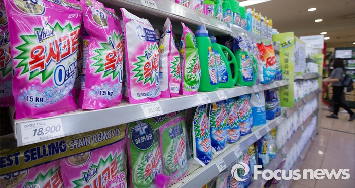 (서울=포커스뉴스) 3일 오전 서울 시내 한 마트에 옥시레킷벤키저 제품들이 진열되어 있다. 지난 2일 아타울라시드 사프달 옥시 대표가 가습기살균제 사건 관련 사과 했지만 피해자 가족과 단체들은 옥시의 사과를 거부하며 1인 시위, 고발장 접수 등 거세게 반발했다.