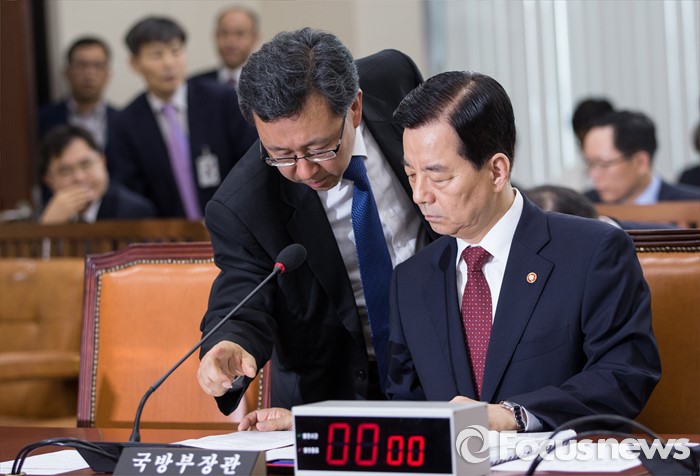 (서울=포커스뉴스) 한민구(오른쪽) 국방부 장관이 3일 오전 서울 여의도 국회에서 열린 국방위원회 전체회의에 참석해 국방부 관계자와 대화하고 있다.